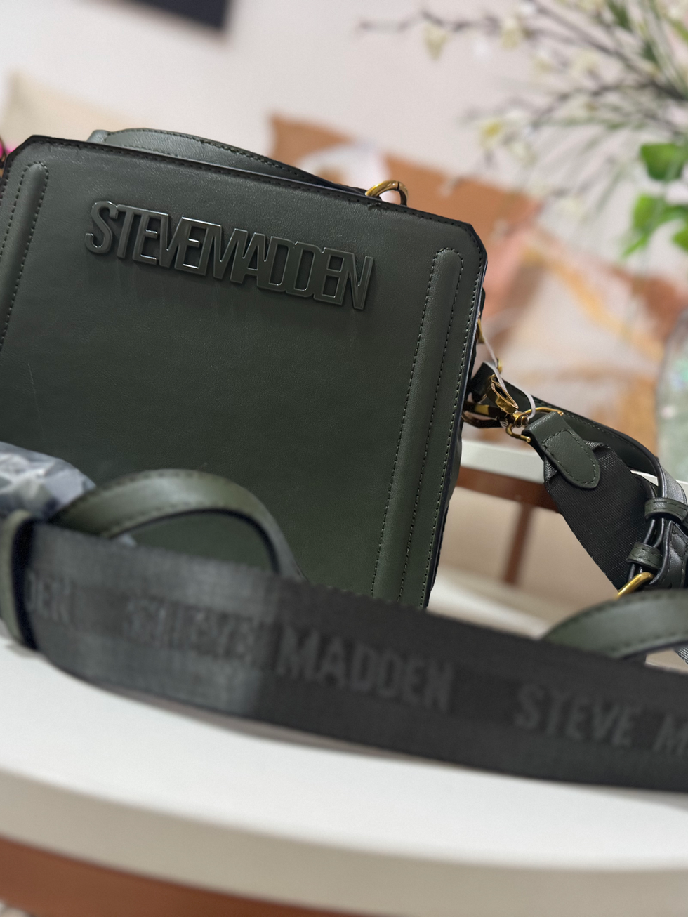 Steve Madden – Olive Urban Crossbody. Este Steve Madden en verde oliva es el bolso perfecto para quienes aman el estilo urbano con un toque sofisticado. El logo en relieve le da personalidad sin esfuerzo, mientras que su diseño estructurado mantiene ese look pulido que funciona tanto para el día como para la noche. La correa ancha —con el nombre de la marca en relieve— añade comodidad y actitud, haciéndolo ideal para días largos, planes espontáneos o looks casual-chic que necesitan un accesorio con carácter.